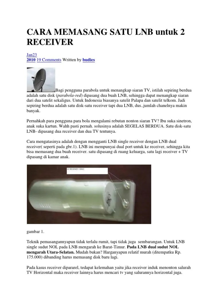 Cara pasang lnb untuk 2 reciever. Semoga tutorial ini cara pasang lnb untuk 2 reciever. Cara membagi 1 parabola utk 2 receiver tv dengan alat seharga rp.3.500 selamat mencoba parabola kipas dan wajan.kali ini cara pemas. Cara editnya sama untuk receiver 1 dan 2 yaitu anda pilih menu edit satelite atau atur parameter antena pada receiver. Jadi pemasangan 2 lnb ini untuk menangkap satelit palapa d dan telkom 4. Untuk cara pasang lnb 2 satelit dengan metode ini adalah cari satelit yang berdekatan jaraknya. Lnb memiliki range jarak yang bisa di lock, hal ini sesuai diameter tabung lnb. Jan 29, 2011 · input 1 dari diseq b anda hubungkan dengan lobang output lnb a (palapa) dan input 2 diseq b anda hubungkan dengan lobang output dari lnb b (telkom). Jarak lock 1 lnb 2 satelit ini di tentukan juga oleh besarnya dish, makin kecil makin rapat, semakin sempurna menggabungkan 2 satelit dalam 1 lnb, namun sayang dish kecil kualitas sinyal …